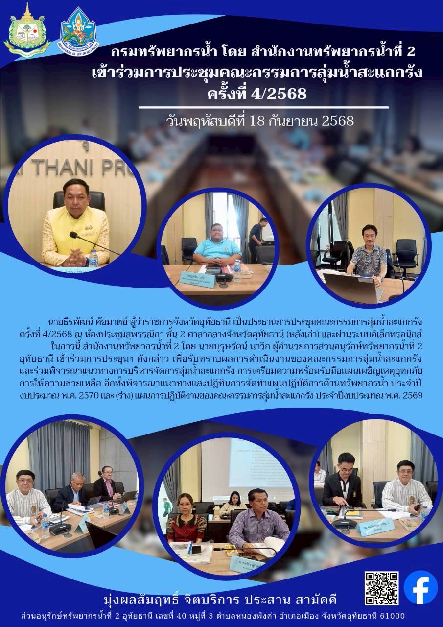 นายธีรพัฒน์ คัชมาตย์ ผู้ว่าราชการจังหวัดอุทัยธานี เป็นประธานการประชุมคณะกรรมการลุ่มน้ำละแกกรั้ง ครังที่ 4/2568 ณ ห้องประชุมสุพรรณิกา ชัน 2 ศาลากลางจังหวัดอุทัยธานี (หลังเก่า) และผ่านระบบอิเล็กทรอนิกลในการนี้ สำนักงานทรัพยากรนำที่ 2 โดย นายบุรุษรัตน์ นาวิก ผู้อำนวยการส่วนอนุรักษ์ทรัพยากรนำที่ 2 อุทัยธานี เข้าร่วมการประชุมฯ ดังกล่าว เพื่อรับทราบผลการดำเนินงานของคณะกรรมการลุ่มนำสะแกกรั้งและร่วมพิจารณาแนวทางการบริหารจัดการลุ่มน้ำสะแกกรัง การเตรียมความพร้อมรับมือแผนเผชิญเหตุอุทกภัยการให้ความช่วยเหลือ อีกทั้งพิจารณาแนวทางและปฏิทินการจัดทำแผนปฏิบัติการด้านทรัพยากรน้ำ ประจำปีงบประมาณ พ.ศ. 2570 และ (ร่าง) แผนการปฏิบัติงานของคณะกรรมการลุ่มนำสะแกกรั้ง ประจำปีงบประมาณ พ.ศ. 2569