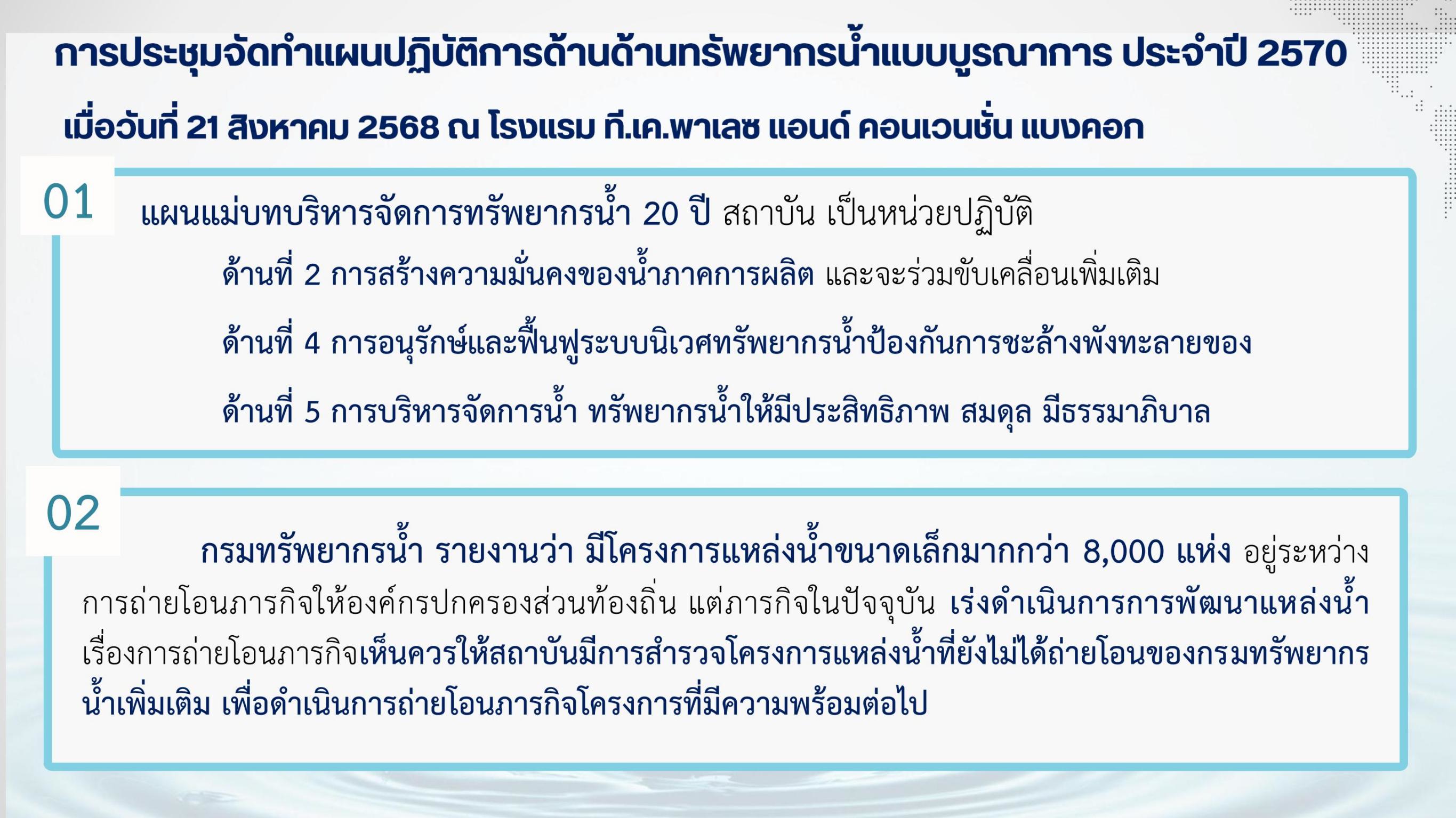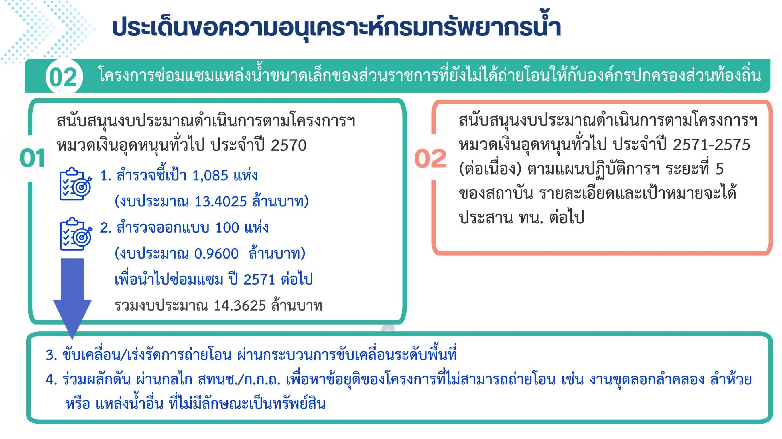 นายนิทัศน์ สุดดีพงษ์ ผู้อำนวยการสำนักงานทรัพยากรน้ำที่ 1 มอบหมายให้ส่วนบำรุงรักษาแหล่งน้ำเข้าร่วมประชุมโครงการซ่อมแซมแหล่งน้ำขนาดเล็กของส่วนราชการที่ยังไม่ได้ถ่ายโอนให้กับองค์กรปกครองส่วนท้องถิ่น ผ่านระบบอิเล็กทรอนิกส์ ระบบ ZOOM โดยมี นายธีระชุณ บุญสิทธิ์ อธิบดีกรมทรัพยากรน้ำ เป็นประธานในพิธี โดยมูลนิธิปิดทองหลังพระฯ รายงานผลการดำเนินงานโครงซ่อมแซมแหล่งน้ำขนาดเล็ก ของส่วนราชการที่ยังไม่ได้ถ่ายโอนให้กับองค์กรปกครองส่วนท้องถิ่นและแนวทางการสนับสนุนโครงการซ่อมแซมแหล่งน้ำขนาดเล็กของส่วนราชการที่ยังไม่ได้ถ่ายโอนให้กับองค์กรปกครองส่วนท้องถิ่น เพื่อให้การขับเคลื่อนการดำเนินงานโครงการฯ บรรลุวัตถุประสงค์