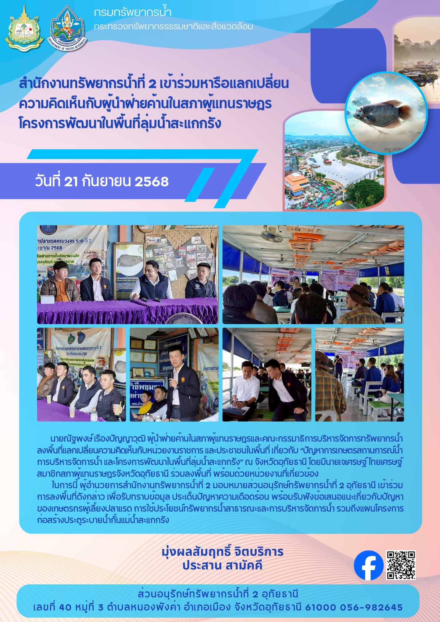 นายณัฐพงษ์ เรืองปัญญาวุฒิ ผู้นำฝ่ายค้านในสภาผู้แทนราษฎรและคณะกรรมาธิการบริหารจัดการทรัพยากรน้ำ ลงพื้นที่แลกเปลี่ยนความคิดเห็นกับหน่วยงานราชการ และประชาชนในพื้นที่ เกี่ยวกับ “ปัญหาการเกษตรสถานการณ์น้ำการบริหารจัดการน้ำ และโครงการพัฒนาในพื้นที่ลุ่มน้ำสะแกกรัง” ณ จังหวัดอุทัยธานี โดยมีนายเจเศรษฐ์ ไทยเศรษฐ์สมาชิกสภาผู้แทนราษฎรจังหวัดอุทัยธานี ร่วมลงพื้นที่ พร้อมด้วยหน่วยงานที่เกี่ยวข้อง ในการนี้ ผู้อำนวยการสำนักงานทรัพยากรน้ำที่ 2 มอบหมายส่วนอนุรักษ์ทรัพยากรน้ำที่ 2 อุทัยธานีเข้าร่วมการลงพื้นที่ดังกล่าวเพื่อรับทราบข้อมูลประเด็นปัญหาความเดือดร้อน พร้อมรับฟังข้อเสนอแนะเกี่ยวกับปัญหาของเกษตรกรผู้เลี้ยงปลาแรดการใช้ประโยชน์ทรัพยากรน้ำสาธารณะและการบริหารจัดการน้ำ รวมถึงแผนโครงการก่อสร้างประตูระบายน้ำกั้นแม่น้ำสะแกกรัง