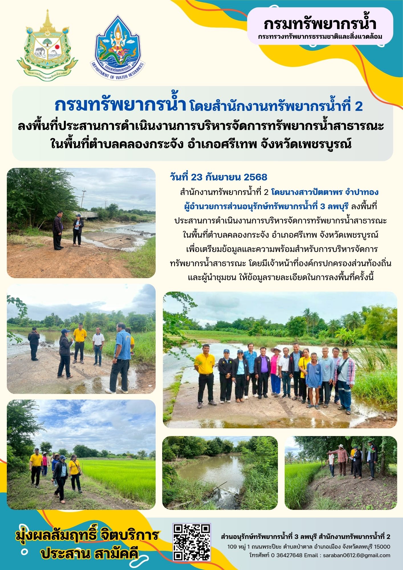 สำนักงานทรัพยากรน้ำที่ 2 โดยนางสาวปัตตาพร จำปาทอง ผู้อำนวยการส่วนอนุรักษ์ทรัพยากรน้ำที่ 3 ลพบุรี ลงพื้นที่ประสานการดำเนินงานการบริหารจัดการทรัพยากรน้ำสาธารณะในพื้นที่ตำบลคลองกระจัง อำเภอศรีเทพ จังหวัดเพชรบูรณ์ เพื่อเตรียมข้อมูลและความพร้อมสำหรับการบริหารจัดการทรัพยากรน้ำสาธารณะ โดยมีเจ้าหน้าที่องค์กรปกครองส่วนท้องถิ่น และผู้นำชุมชน ให้ข้อมูลรายละเอียดในการลงพื้นที่ครั้งนี้