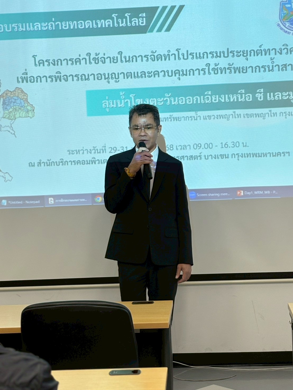 วันที่ 29 ตุลาคม 2568 นายโภคิน ช้ำเกตุ ผู้อำนวยการสำนักงานทรัพยากรน้ำที่ 11 มอบหมายให้ นางพรพรรณ์ ฉลาดล้ำ วิศวกรโยธาชำนาญการ รักษาการในตำแหน่ง วิศวกรโยธาชำนาญการพิเศษ ส่วนการจัดสรรน้ำ เข้าร่วมการฝึกอบรมการใช้งาน และถ่ายทอดเทคโนโลยีโครงการค่าใช้จ่ายในการจัดทำโปรแกรมประยุกต์ทางวิศวกรรม เพื่อการพิจารณาอนุญาตและควบคุมการใช้ทรัพยากรน้ำสาธารณะ พื้นที่ลุ่มน้ำโขงตะวันออก เฉียงเหนือ ชี และมูล กรมทรัพยากรน้ำ แขวงพญาไท เขตพญาไท กรุงเทพมหานคร ณ สำนักบริการ คอมพิวเตอร์ มหาวิทยาลัยเกษตรศาสตร์ บางเขน แขวงลาดยาว เขตจตุจักร กรุงเทพมหานครฯ