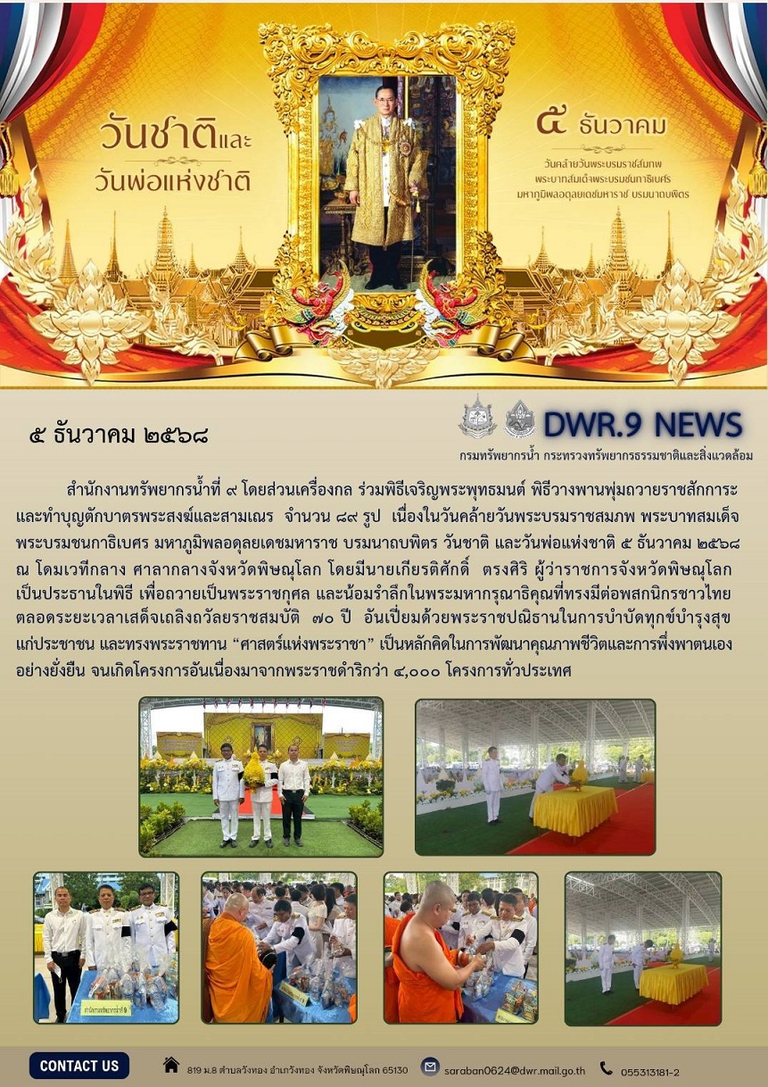สำนักงานทรัพยากรน้ำที่ ๙ โดยส่วนเครื่องกล ร่วมพิธีเจริญพระพุทธมนต์ พิธีวางพานพุ่มถวายราชสักการะ และทำบุญตักบาตรพระสงฆ์และสามเณร จำนวน ๘๙ รูป เนื่องในวันคล้ายวันพระบรมราชสมภพ พระบาทสมเด็จพระบรมชนกาธิเบศร มหาภูมิพลอดุลยเดชมหาราช บรมนาถบพิตร วันชาติ และวันพ่อแห่งชาติ ๕ ธันวาคม ๒๕๖๘ ณ โดมเวทีกลาง ศาลากลางจังหวัดพิษณุโลก โดยมีนายเกียรติศักดิ์ ตรงศิริ ผู้ว่าราชการจังหวัดพิษณุโลก เป็นประธานในพิธี เพื่อถวายเป็นพระราชกุศล และน้อมรำลึกในพระมหากรุณาธิคุณที่ทรงมีต่อพสกนิกรชาวไทย ตลอดระยะเวลาเสด็จเถลิงถวัลยราชสมบัติ ๗๐ ปี อันเปี่ยมด้วยพระราชปณิธานในการบำบัดทุกข์บำรุงสุขแก่ประชาชน และทรงพระราชทาน “ศาสตร์แห่งพระราชา” เป็นหลักคิดในการพัฒนาคุณภาพชีวิตและการพึ่งพาตนเองอย่างยั่งยืน จนเกิดโครงการอันเนื่องมาจากพระราชดำริกว่า ๔,๐๐๐ โครงการทั่วประเทศ