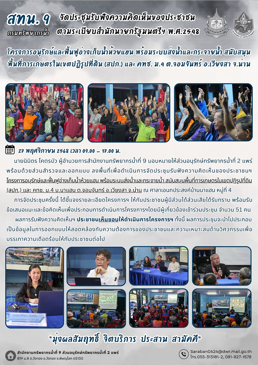 นายนิมิตร โคตรบัว ผู้อำนวยการสำนักงานทรัพยากรน้ำที่ 9 มอบหมายให้ส่วนอนุรักษ์ทรัพยากรน้ำที่ 2 แพร่พร้อมด้วยส่วนสำรวจและออกแบบ ลงพื้นที่เพื่อดำเนินการจัดประชุมรับฟังความคิดเห็นของประชาชนฯ โครงการอนุรักษ์และฟื้นฟูอ่างเก็บน้ำห้วยแฮน พร้อมระบบส่งน้ำและกระจายน้ำ สนับสนุนพื้นที่การเกษตรในเขตปฏิรูปที่ดิน (สปก.) และ คทช. ม.4 บ.นาแฮน ต.จอมจันทร์ อ.เวียงสา จ.น่าน ณ ศาลาเอนกประสงค์บ้านนาแฮน หมู่ที่ 4