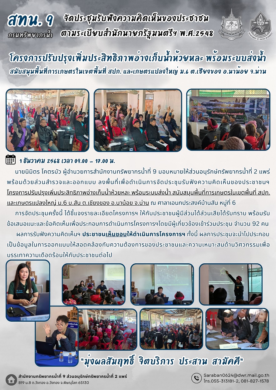 นายนิมิตร โคตรบัว ผู้อำนวยการสำนักงานทรัพยากรน้ำที่ 9 มอบหมายให้ส่วนอนุรักษ์ทรัพยากรน้ำที่ 2 แพร่พร้อมด้วยส่วนสำรวจและออกแบบ ลงพื้นที่เพื่อดำเนินการจัดประชุมรับฟังความคิดเห็นของประชาชนฯ โครงการปรับปรุงเพิ่มประสิทธิภาพอ่างเก็บน้ำห้วยหละ พร้อมระบบส่งน้ำ สนับสนุนพื้นที่การเกษตรในเขตพื้นที่ สปก. และเกษตรแปลงใหญ่ ม.6 บ.สัน ต.เชียงของ อ.นาน้อย จ.น่าน ณ ศาลาเอนกประสงค์บ้านสัน หมู่ที่ 6