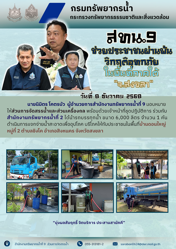 วันที่ 8 ธันวาคม 2568 นายนิมิตร โคตรบัว ผู้อำนวยการสำนักงานทรัพยากรน้ำที่ 9 มอบหมายให้ส่วนการจัดสรรน้ำและส่วนเครื่องกล พร้อมด้วยเจ้าหน้าที่ชุดปฏิบัติการ ร่วมกับสำนักงานทรัพยากรน้ำที่ 2 ได้นำรถบรรทุกน้ำ ขนาด 6,000 ลิตร จำนวน 1 คันดำเนินการแจกจ่ายน้ำสะอาดเพื่ออุปโภค บริโภคให้กับประชาชนในพื้นที่บ้านดอนใหญ่ หมู่ที่ 2 ตำบลชิงโค อำเภอสิงหนคร จังหวัดสงขลา