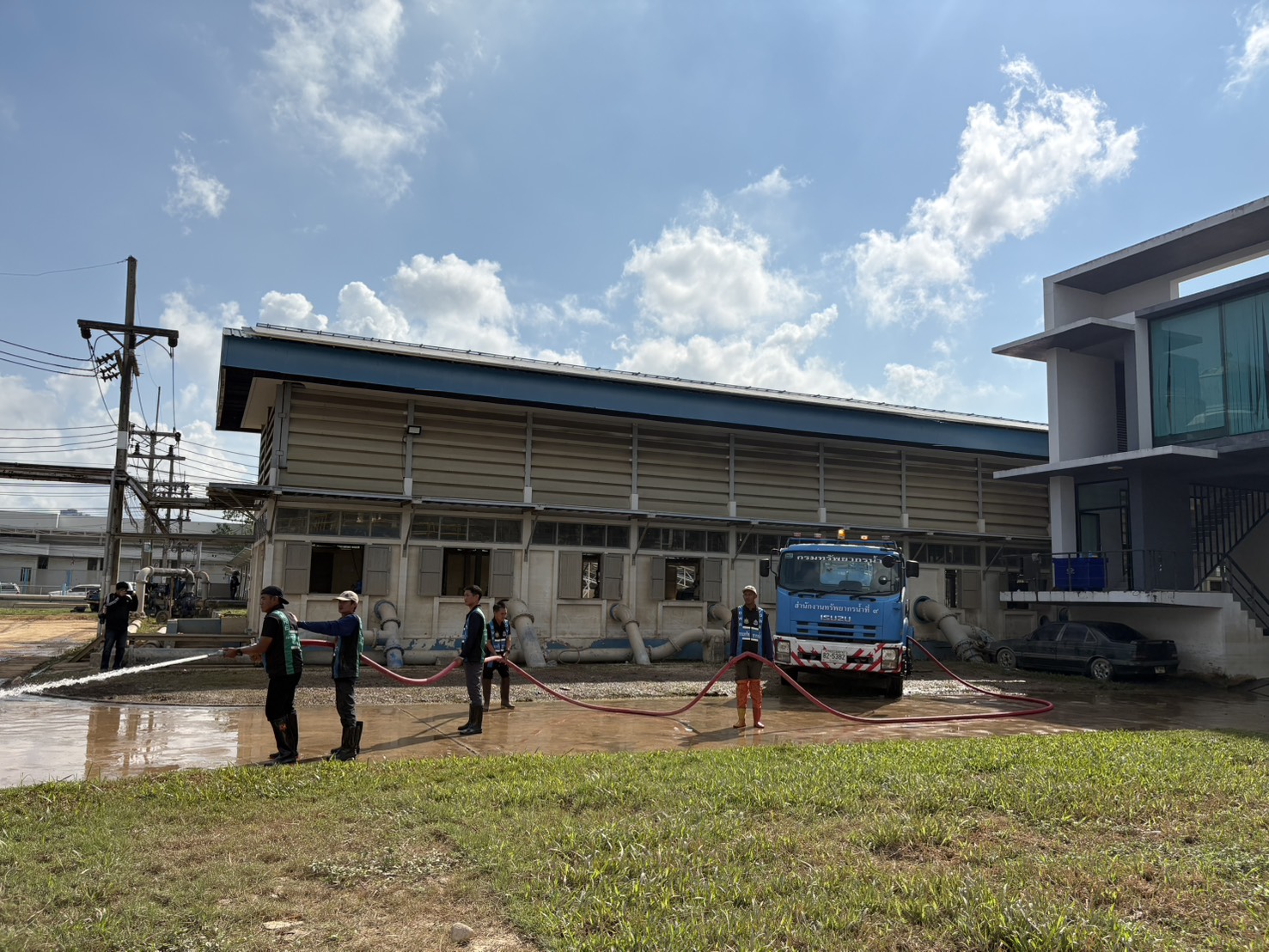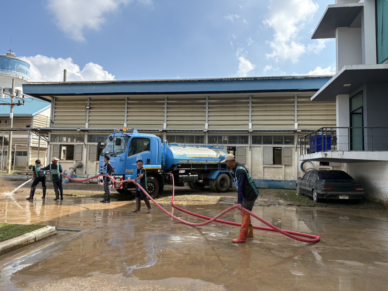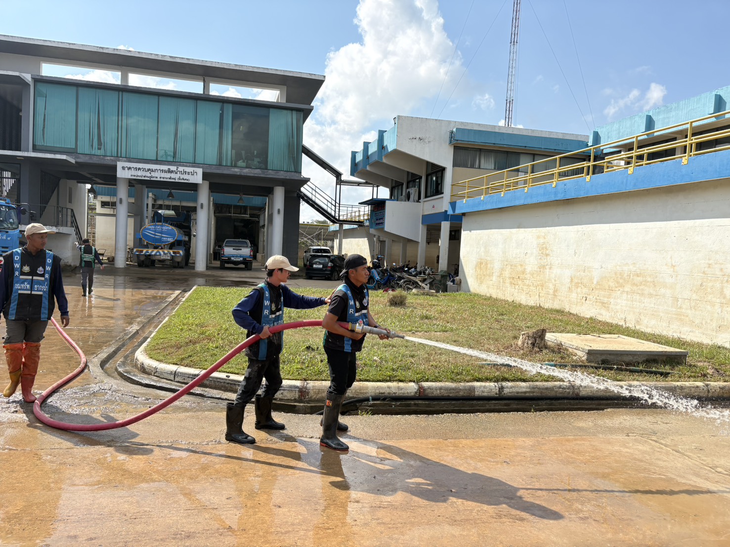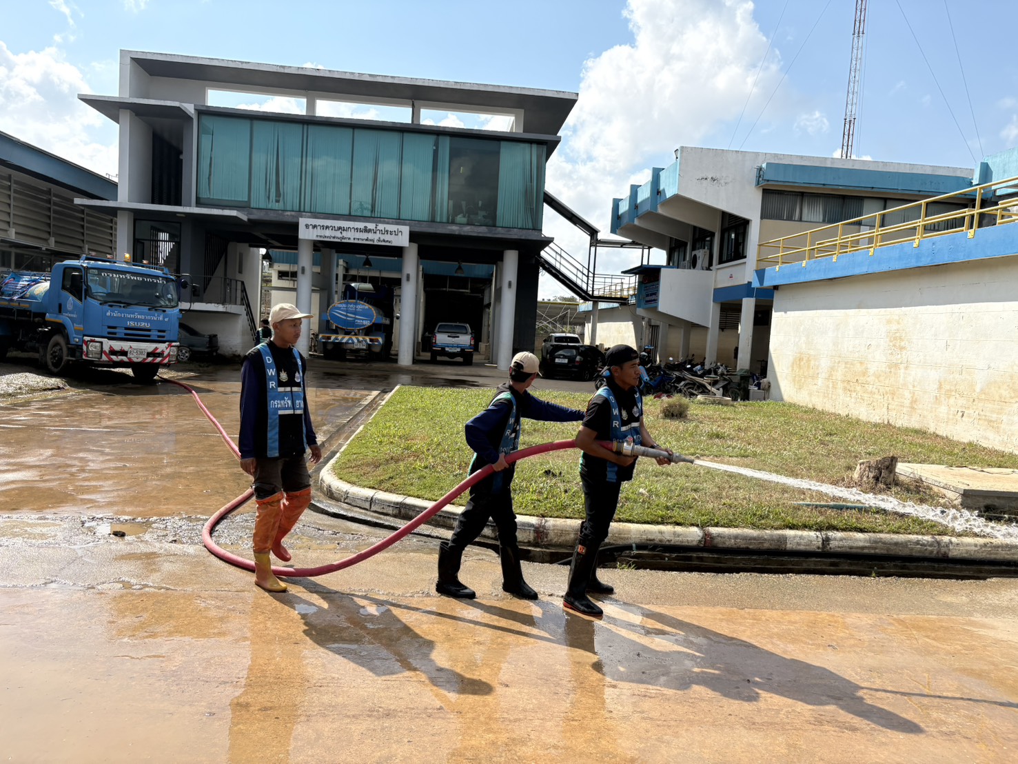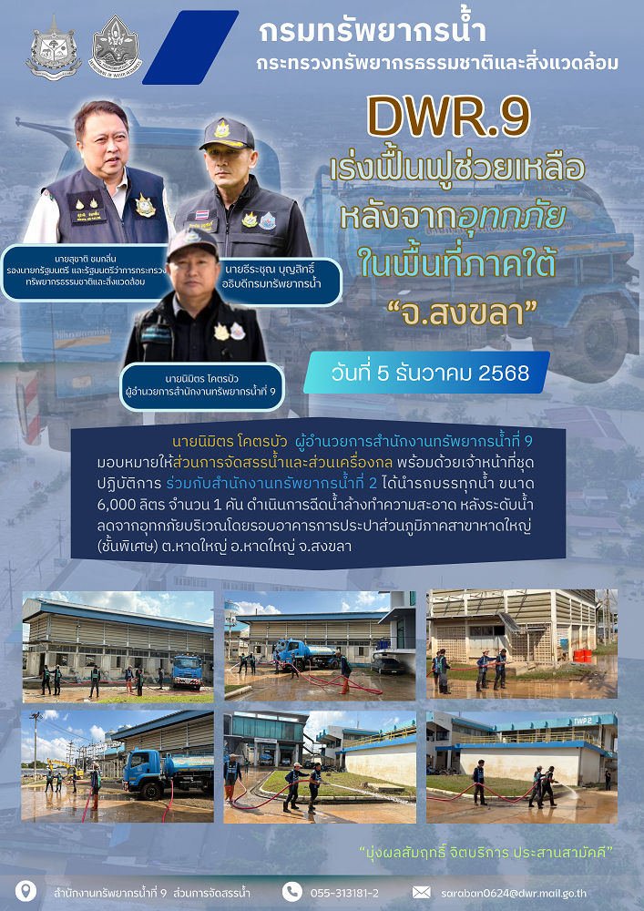 วันที่ 5 ธันวาคม 2568 นายนิมิตร โคตรบัว ผู้อำนวยการสำนักงานทรัพยากรน้ำที่ 9 มอบหมายให้ส่วนการจัดสรรน้ำและส่วนเครื่องกล พร้อมด้วยเจ้าหน้าที่ชุดปฏิบัติการ ร่วมกับสำนักงานทรัพยากรน้ำที่ 2 ได้นำรถบรรทุกน้ำ ขนาด 6,000 ลิตร จำนวน 1 คัน ดำเนินการฉีดน้ำล้างทำความสะอาด หลังระดับน้ำลดจากอุทกภัยบริเวณโดยรอบอาคารการประปาส่วนภูมิภาคสาขาหาดใหญ่ (ชั้นพิเศษ) ต.หาดใหญ่ อ.หาดใหญ่ จ.สงขลา