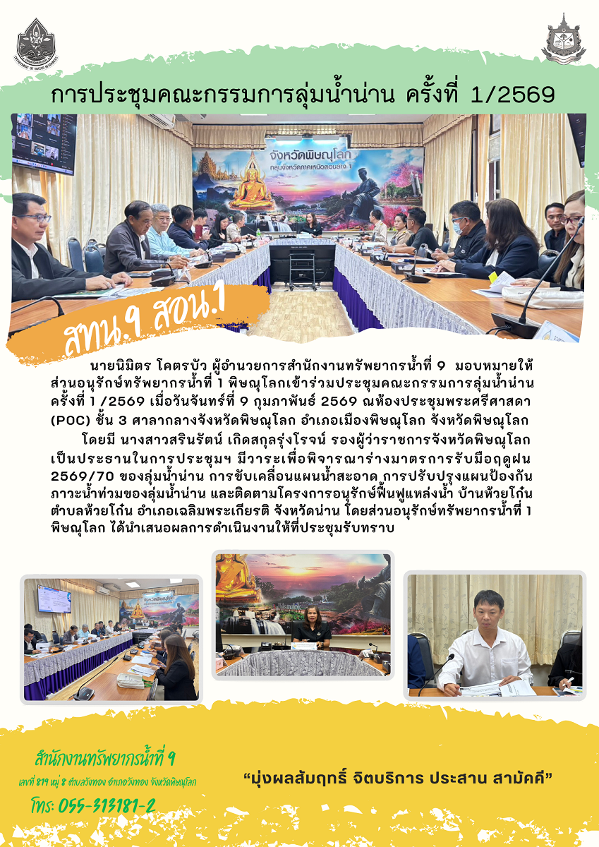 นายนิมิตร โคตรบัว ผู้อำนวยการสำนักงานทรัพยากรน้ำที่ 9 มอบหมายให้ ส่วนอนุรักษ์ทรัพยากรน้ำที่ 1 พิษณุโลกเข้าร่วมประชุมคณะกรรมการลุ่มน้ำน่าน ครั้งที่ 1 /2569 เมื่อวันจันทร์ที่ 9 กุมภาพันธ์ 2569 ณห้องประชุมพระศรีศาสดา (POC) ชั้น 3 ศาลากลางจังหวัดพิษณุโลก อำเภอเมืองพิษณุโลก จังหวัดพิษณุโลก