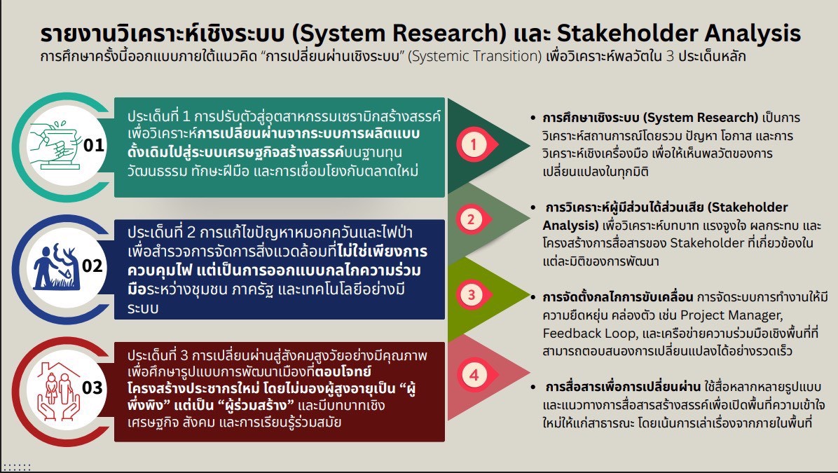 ในที่ประชุมร่วมกันระดมความคิดเห็นและวิเคราะห์ศักยภาพและความพร้อมของจังหวัดลำปาง โดยใช้เครื่องมือ SWOT/TOWS เพื่อวิเคราะห์จุดแข็ง จุดอ่อน โอกาส และความท้าทาย กำหนดภาพอนาคตและทิศทางการพัฒนาเมือง รวมทั้งประเด็นยุทธศาสตร์หลักในการขับเคลื่อนลำปางสู่เมืองเศรษฐกิจสร้างสรรค์ ด้านการออกแบบ ซึ่งจะนำไปใช้เป็นฐานข้อมูลสำคัญในการจัดทำยุทธศาสตร์ที่เกิดจากความต้องการและข้อมูลจริงในพื้นที่ เพื่อผลักดันให้จังหวัดลำปางก้าวสู่เมืองเศรษฐกิจสร้างสรรค์และเมืองแห่งการเรียนรู้อย่างยั่งยืนต่อไป