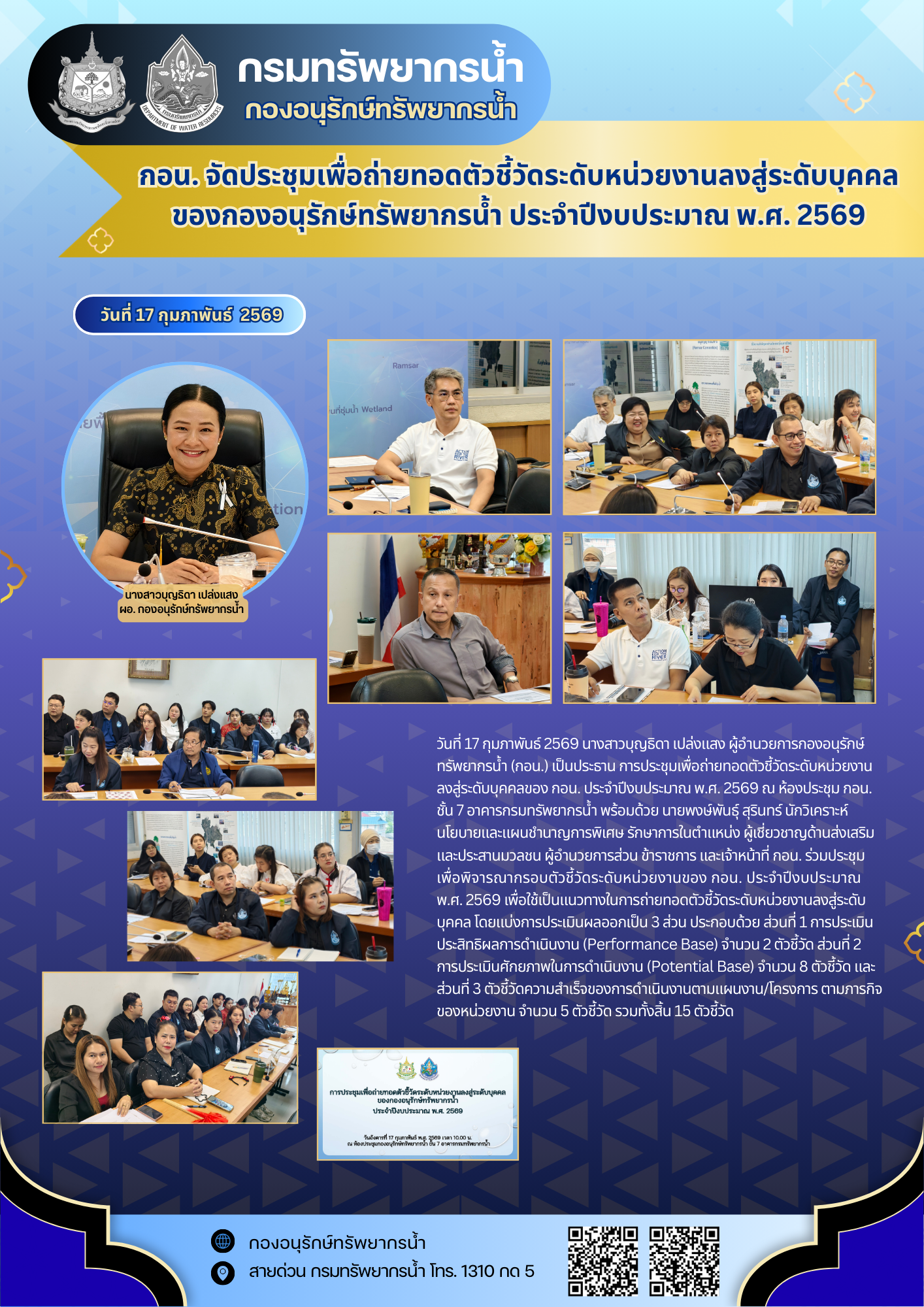 วันที่ 17 กุมภาพันธ์ 2569 นางสาวบุญธิดา เปล่งแสง ผู้อำนวยการกองอนุรักษ์ทรัพยากรน้ำ (กอน.) เป็นประธาน การประชุมเพื่อถ่ายทอดตัวชี้วัดระดับหน่วยงานลงสู่ระดับบุคคลของ กอน. ประจำปีงบประมาณ พ.ศ. 2569 ณ ห้องประชุม กอน. ชั้น 7 อาคารกรมทรัพยากรน้ำ พร้อมด้วย นายพงษ์พันธุ์ สุรินทร์ นักวิเคราะห์นโยบายและแผนชำนาญการพิเศษ รักษาการในตำแหน่ง ผู้เชี่ยวชาญด้านส่งเสริมและประสานมวลชน ผู้อำนวยการส่วน ข้าราชการ และเจ้าหน้าที่ กอน. ร่วมประชุมเพื่อพิจารณากรอบตัวชี้วัดระดับหน่วยงานของ กอน. ประจำปีงบประมาณ พ.ศ. 2569 เพื่อใช้เป็นแนวทางในการถ่ายทอดตัวชี้วัดระดับหน่วยงานลงสู่ระดับบุคคล โดยแบ่งการประเมินผลออกเป็น 3 ส่วน ประกอบด้วย ส่วนที่ 1 การประเมินประสิทธิผลการดำเนินงาน (Performance Base) จำนวน 2 ตัวชี้วัด ส่วนที่ 2 การประเมินศักยภาพในการดำเนินงาน (Potential Base) จำนวน 8 ตัวชี้วัด และส่วนที่ 3 ตัวชี้วัดความสำเร็จของการดำเนินงานตามแผนงาน/โครงการ ตามภารกิจของหน่วยงาน จำนวน 5 ตัวชี้วัด รวมทั้งสิ้น 15 ตัวชี้วัด