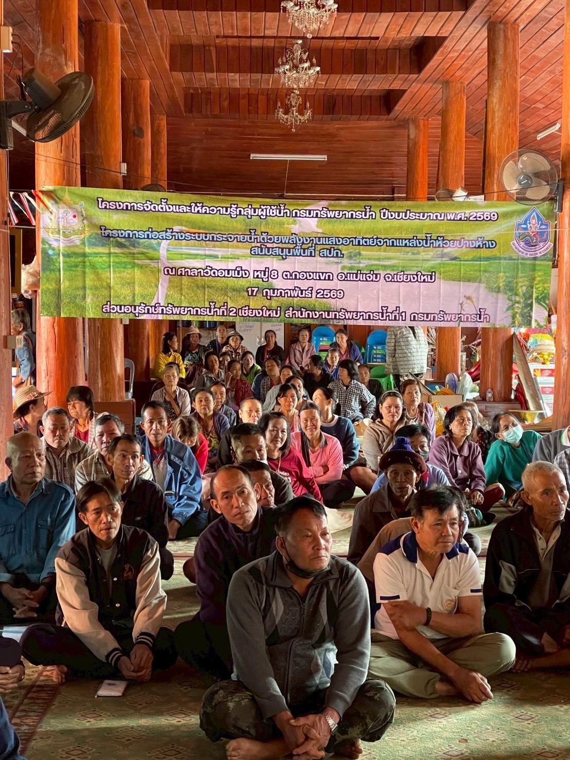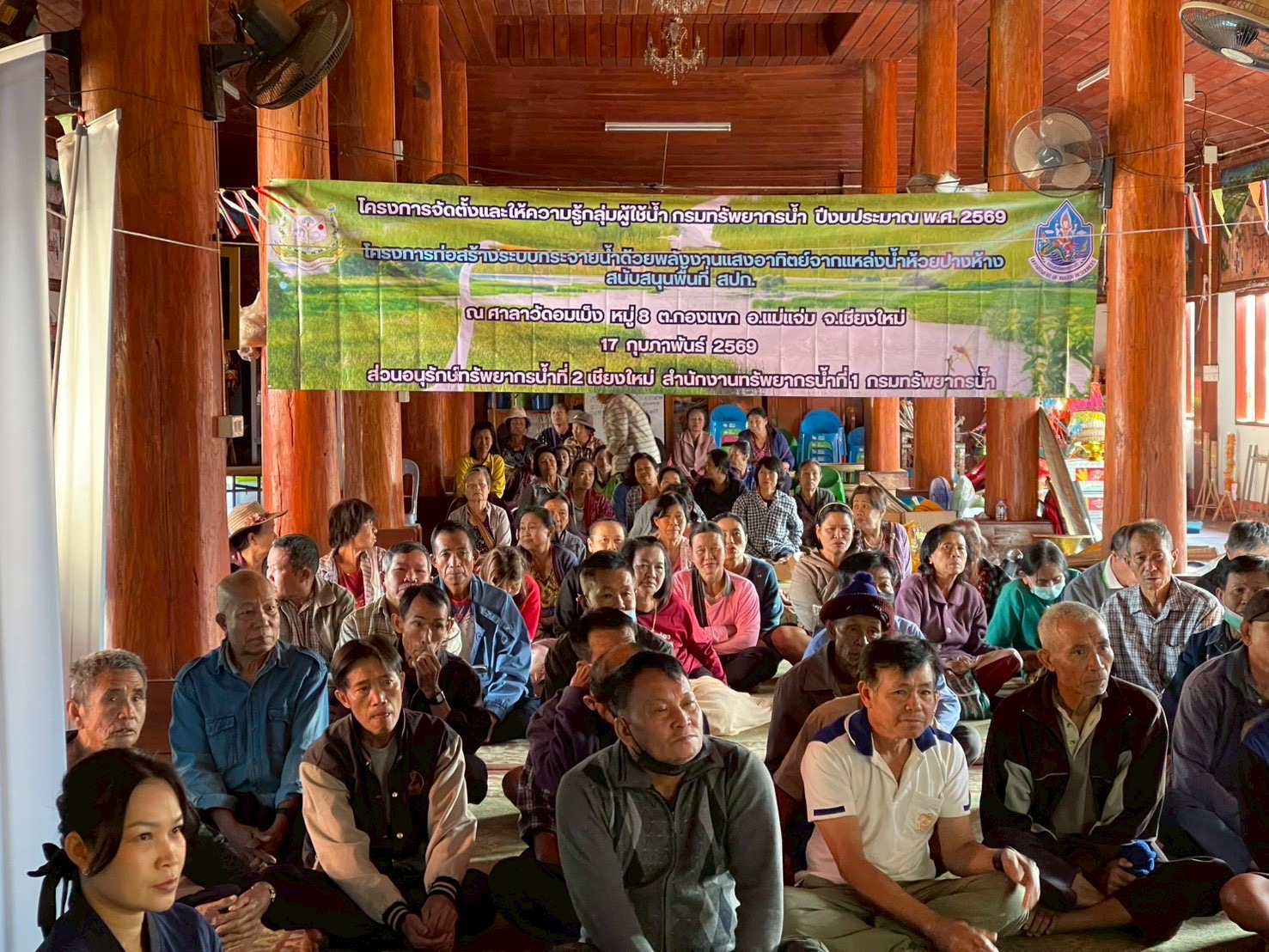 นางสาวสุพัดสอน สีมืด ผู้อำนวยการสำนักงานทรัพยากรน้ำที่ 1 มอบหมายให้ส่วนอนุรักษ์ทรัพยากรน้ำที่ 2 เชียงใหม่ ดำเนินโครงการจัดตั้งและให้ความรู้กลุ่มผู้ใช้น้ำ (แหล่งน้ำที่กรมทรัพยากรน้ำดำเนินการก่อสร้างและบำรุงรักษา) ปีงบประมาณ พ.ศ. 2569 กลุ่มผู้ใช้น้ำโครงการก่อสร้างระบบกระจายน้ำด้วยพลังงานแสงอาทิตย์จากแหล่งน้ำห้วยปางห้าง สนับสนุนพื้นที่ สปก. บ้านอมเม็ง หมู่ 8 ตำบลกองแขก อำเภอแม่แจ่ม จังหวัดเชียงใหม่ โดยมี ผู้แทนนายกองค์การบริหารส่วนตำบลกองแขก เป็นประธานเปิดโครงการฯ และให้แนวคิดการบริหารจัดการน้ำตามหลักปรัชญาเศรษฐกิจพอเพียง ณ ศาลาวัดอมเม็ง หมู่ 8 ตำบลกองแขก อำเภอแม่แจ่ม จังหวัดเชียงใหม่ เพื่อให้มีการบริหารจัดการทรัพยากรน้ำ และรวมกลุ่มดูแลบำรุงรักษาแหล่งน้ำ ให้อยู่ในสภาพดี และมีประสิทธิภาพ สามารถจัดสรรแบ่งปันน้ำระหว่างสมาชิกในกลุ่มได้อย่างเป็นธรรมและเกิดประโยชน์สูงสุด โดยมีผู้เข้าร่วมโครงการ จำนวน 60 คน