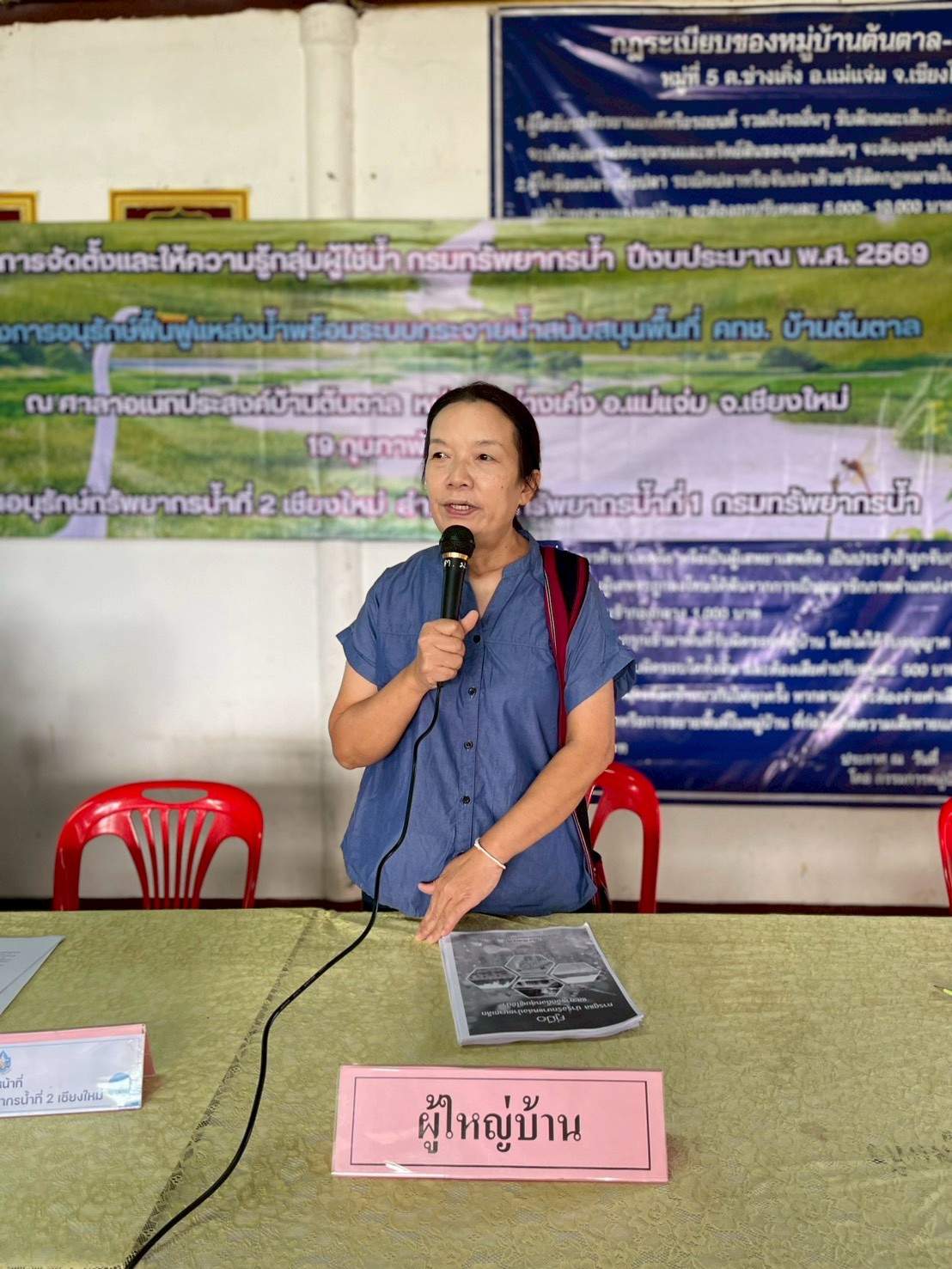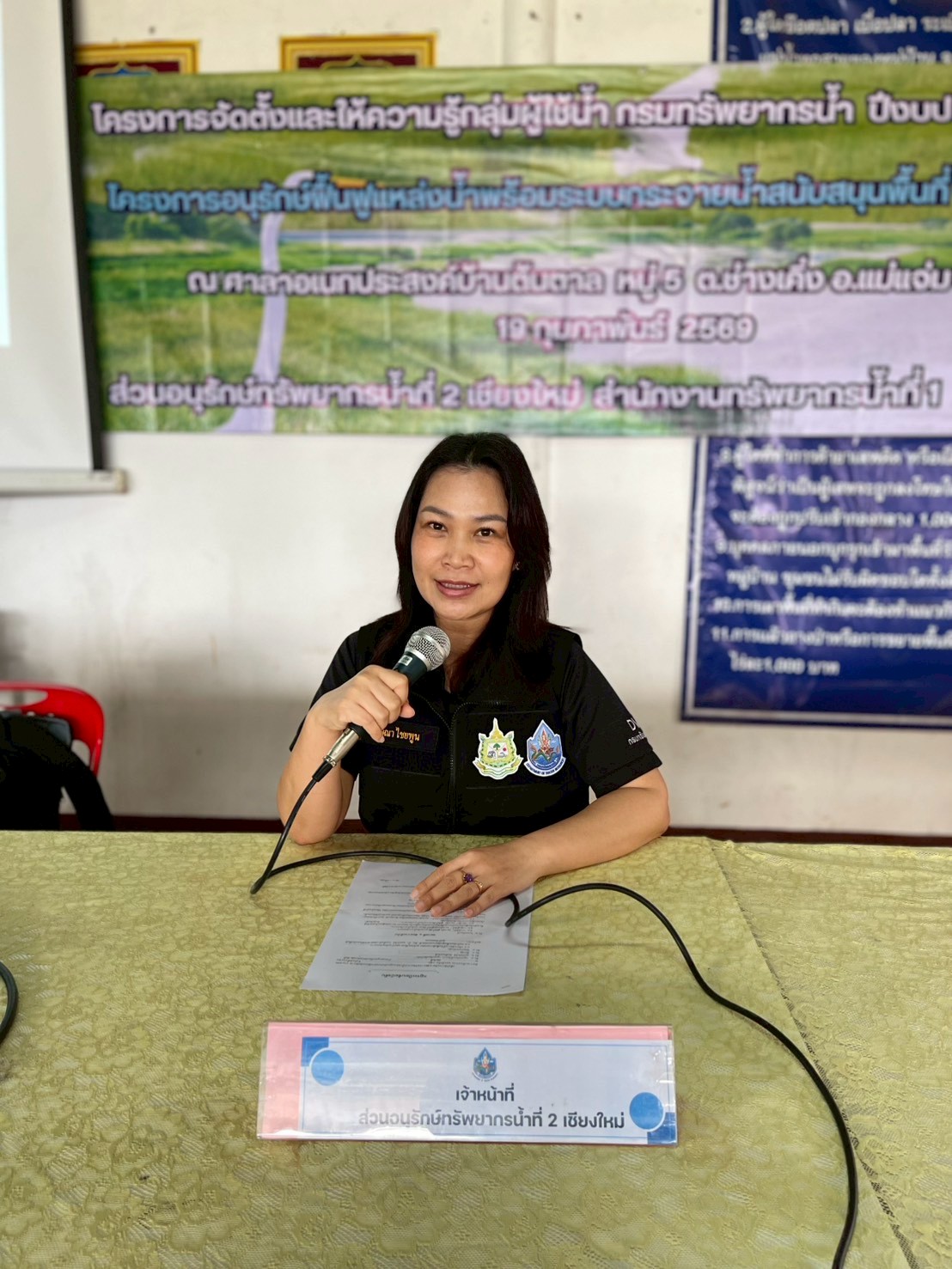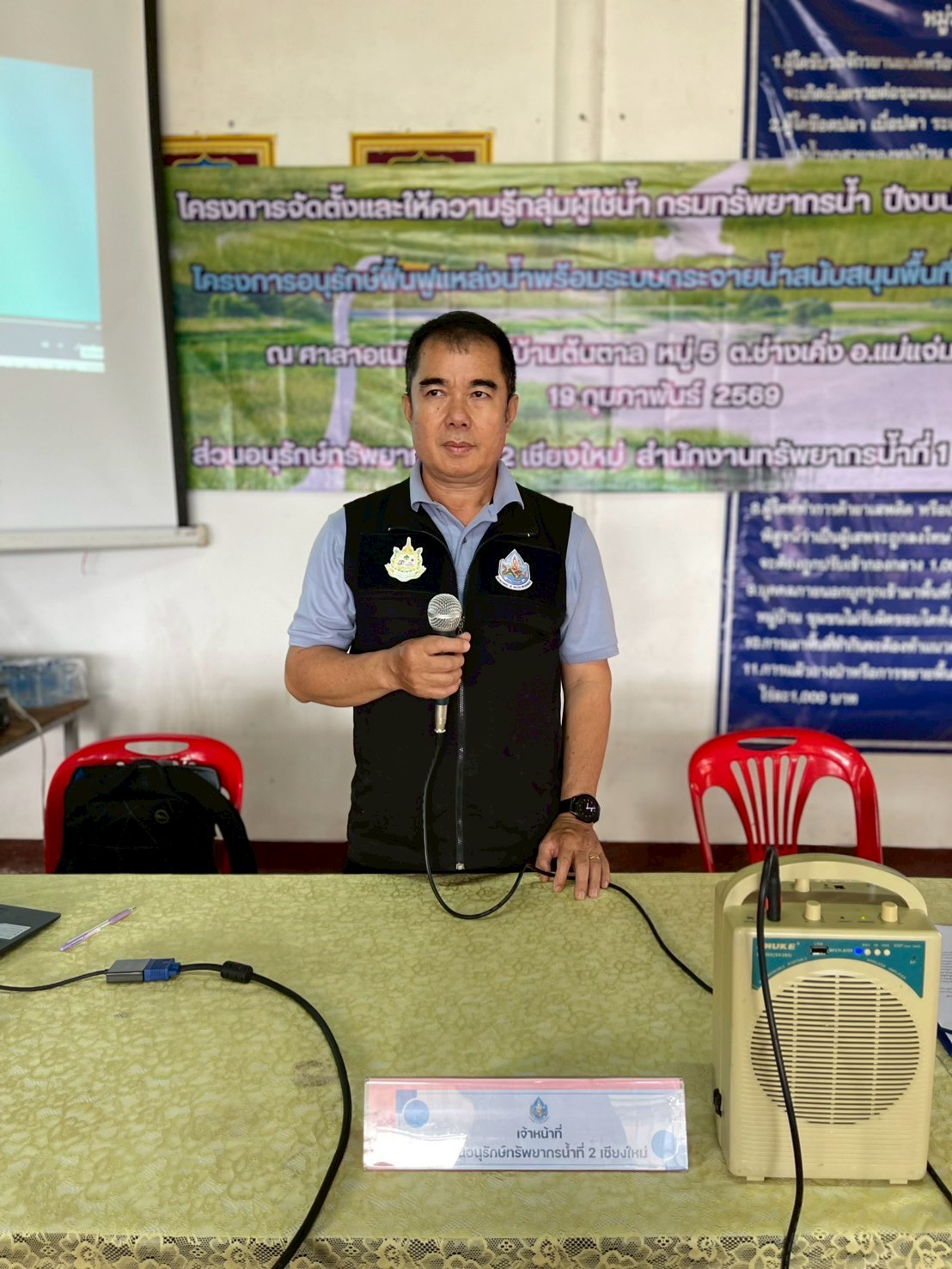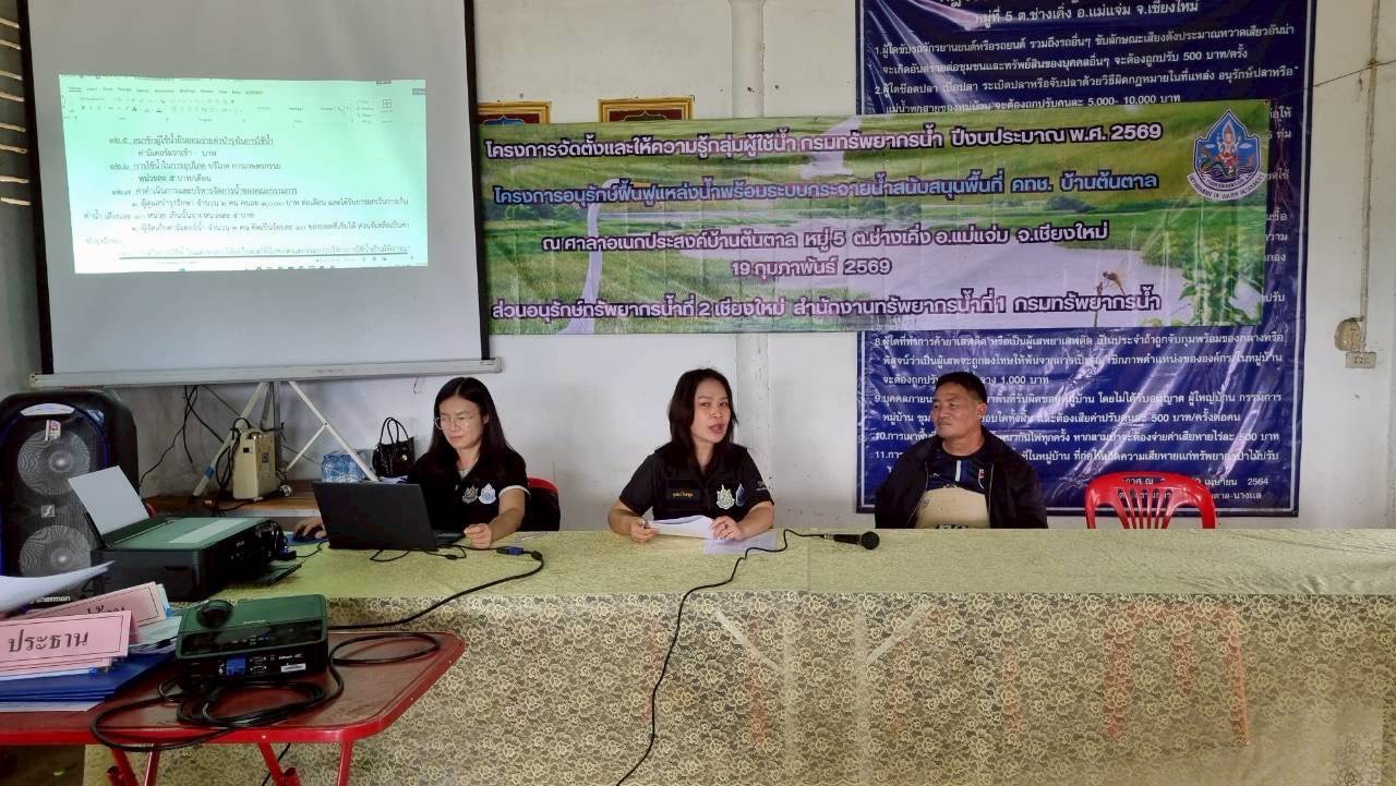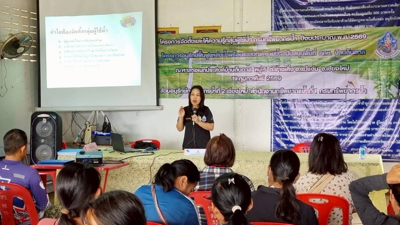 นางสาวสุพัดสอน สีมืด ผู้อำนวยการสำนักงานทรัพยากรน้ำที่ 1 มอบหมายให้ส่วนอนุรักษ์ทรัพยากรน้ำที่ 2 เชียงใหม่ ดำเนินโครงการจัดตั้งและให้ความรู้กลุ่มผู้ใช้น้ำ (แหล่งน้ำที่กรมทรัพยากรน้ำดำเนินการก่อสร้างและบำรุงรักษา) ปีงบประมาณ พ.ศ. 2569 กลุ่มผู้ใช้น้ำโครงการอนุรักษ์ฟื้นฟูแหล่งน้ำพร้อมระบบกระจายน้ำสนับสนุนพื้นที่ คทช. บ้านต้นตาลหมู่ 5 ตำบลช่างเคิ่ง อำเภอแม่แจ่ม จังหวัดเชียงใหม่ โดยมี นายธวัชชัย ยาวิชัย ตำแหน่ง นักจัดการงานทั่วไปชำนาญการ ผู้แทนนายกองค์การบริหารส่วนตำบลช่างเคิ่ง เป็นประธานเปิดโครงการฯ และให้แนวคิดการบริหารจัดการน้ำ ตามหลักปรัชญาเศรษฐกิจพอเพียง ณ ศาลาอเนกประสงค์บ้านต้นตาล หมู่ 5 ตำบลช่างเคิ่ง อำเภอแม่แจ่ม จังหวัดเชียงใหม่ เพื่อให้มีการบริหารจัดการทรัพยากรน้ำ และรวมกลุ่มดูแลบำรุงรักษาแหล่งน้ำ ให้อยู่ในสภาพดี และมีประสิทธิภาพ สามารถจัดสรรแบ่งปันน้ำระหว่างสมาชิกในกลุ่มได้อย่างเป็นธรรมและเกิดประโยชน์สูงสุด โดยมีผู้เข้าร่วมโครงการ จำนวน 40 คน